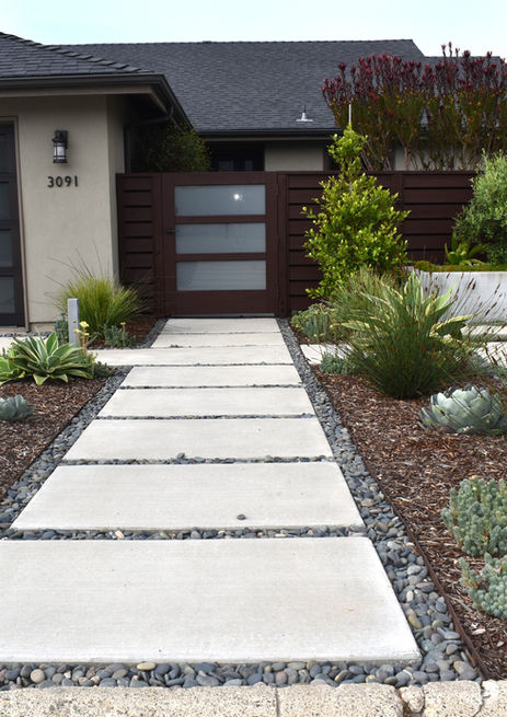 Modern landscape with plantings in gray/silver tones with ornamental grasses, shrubs, succulents and Agave.